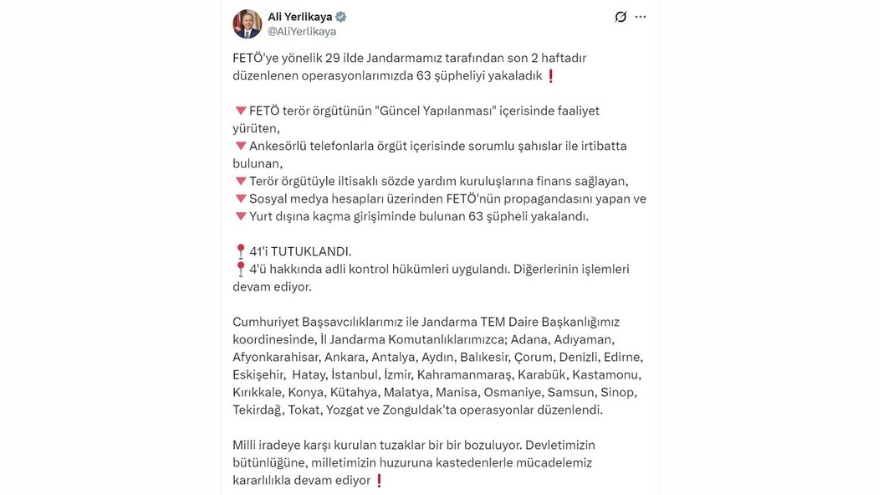 FETÖ’ye yönelik yürütülen operasyonlar kapsamında 29 ilde eş zamanlı çalışmalar gerçekleştirildi. İçişleri Bakanı Ali Yerlikaya’nın paylaştığı bilgilere göre operasyonlarda 63 şüpheli gözaltına alındı, adli süreç sonucunda 41 kişi tutuklandı, bazı şüpheliler hakkında ise adli kontrol kararı verildi.