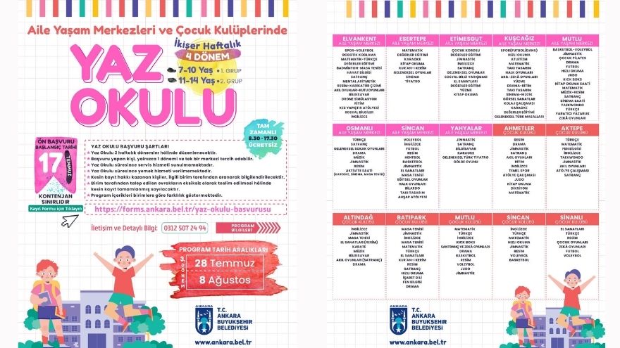 Ankara Büyükşehir Belediyesi'nin yaz okulu programına başvurular, https://forms.ankara.bel.tr/yaz-okulu-basvurusu adresi üzerinden çevrim içi olarak gerçekleştirilecek.