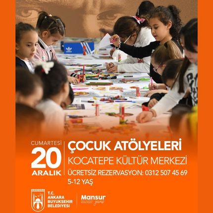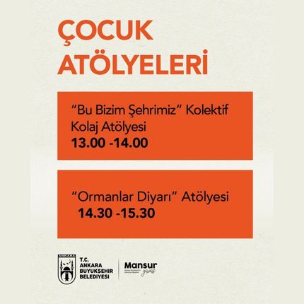 Ankara Büyükşehir Belediyesi, bu hafta sonu 5-12 yaş arasındaki çocuklar için iki yaratıcı atölye etkinliği düzenleyecek. Düzenlenecek etkinlik kapsamında çocuklar, ‘Bu Bizim Şehrimiz’ kolektif kolaj atölyesi ve ‘Ormanlar Diyarı’ atölyesinde bir araya gelecek. Çocukların hayal gücünü geliştirmeyi amaçlayan etkinlikler ücretsiz olup, katılım için rezervasyon yapılması gerekmektedir.