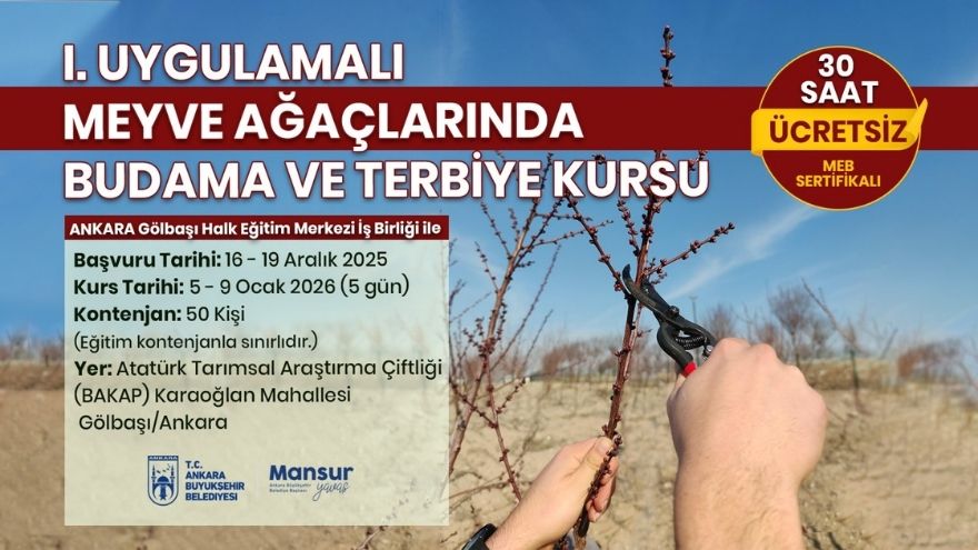 5-9 Ocak 2026 tarihleri arasında gerçekleştirilecek olan kursa katılacak kişiler, Gölbaşı'ndaki Karaoğlan Mahallesi’nde bulunan ATA Çiftliği’ne (BAKAP) gelerek yerinde eğitim alacak ve uygulamalı olarak budama tekniklerini öğrenme fırsatı bulacak.