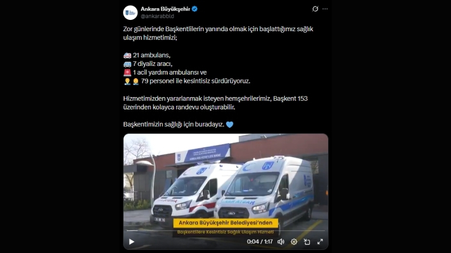 Ankara Büyükşehir Belediyesi, sosyal medya hesapları üzerinden yaptığı açıklamada sağlık ulaşım hizmetinin kesintisiz devam ettiğini duyurdu. Vatandaşların özellikle zor zamanlarında hızlı ve erişilebilir destek sunmayı amaçlayan uygulamanın, geniş araç filosu ve uzman personeliyle bugüne kadar on binlerce kişiye ulaştığı belirtildi. ABB, hizmete ihtiyaç duyanlara Başkent 153 üzerinden kolay randevu imkânı sunuyor.