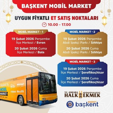 ‘’Başkent Mobil Market’te uygun fiyatlı et satışları başlıyor! Et satışları 19 Şubat Perşembe günü Evren İlçe Merkezi, Sıhhiye Abdi İpekçi Parkı ve Şereflikoçhisar İlçe Merkezi’nde; 20 Şubat Cuma günü Balâ İlçe Merkezi, Sıhhiye Abdi İpekçi Parkı ve Şereflikoçhisar İlçe Merkezi’nde olacak.’’