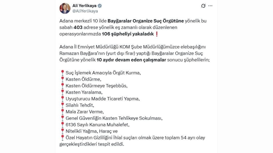 İçişleri Bakanı Ali Yerlikaya, Adana Emniyet Müdürlüğü koordinasyonunda yürütülen operasyonla organize suç örgütü 'Bayğaralar'a darbe vurulduğunu açıkladı. 10 ilde gerçekleştirilen eş zamanlı baskınlarda 106 şüpheli yakalandı, silahlar, patlayıcılar ve uyuşturucular ele geçirildi.