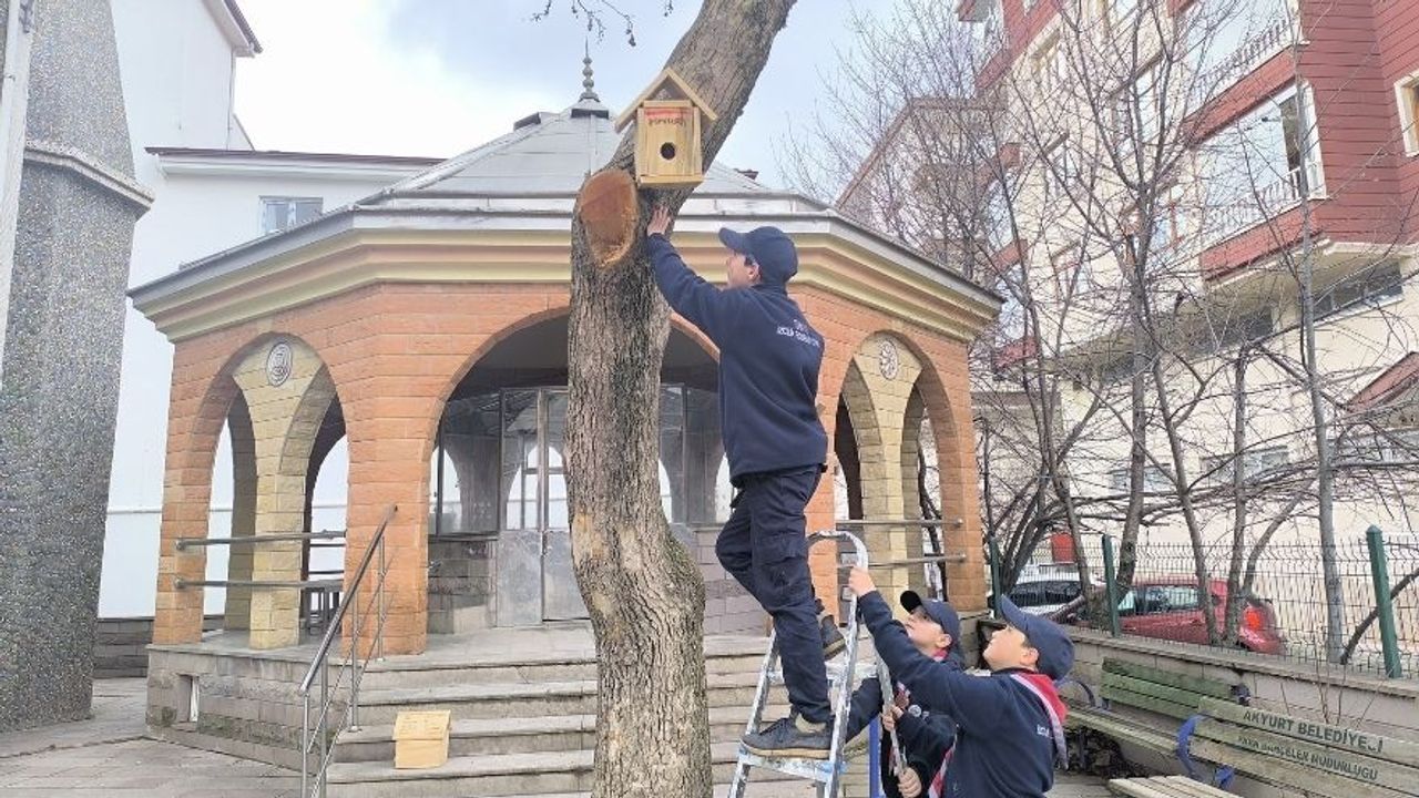 Ankara'nın Akyurt ilçesinde etkili olan kar yağışı ve dondurucu soğuk hava, doğadaki kuşların beslenmesini zorlaştırmaya devam ediyor. İlçe Müftülüğü bünyesinde faaliyet gösteren izci grubu, kuşların bu zorlu kış şartlarından olumsuz etkilenmemesi için anlamlı bir çalışma başlattı. Hazırlanan özel yuvalar ve yemlikler, ilçenin farklı noktalarında belirlenen ağaçlık alanlara yerleştirildi.
