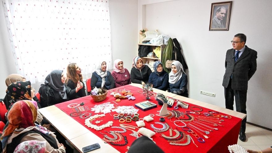 Merkezdeki kursları tek tek gezen Veysel Tiryaki, kadın kursiyerlerle sohbet etti.