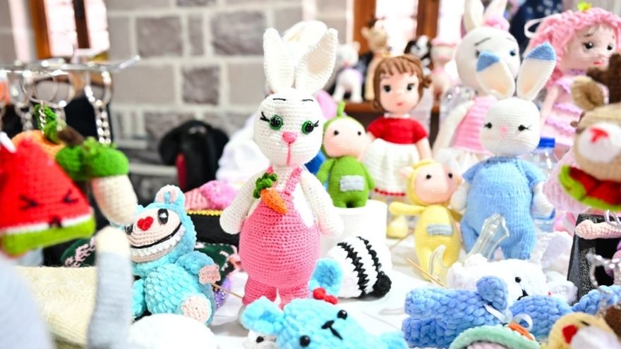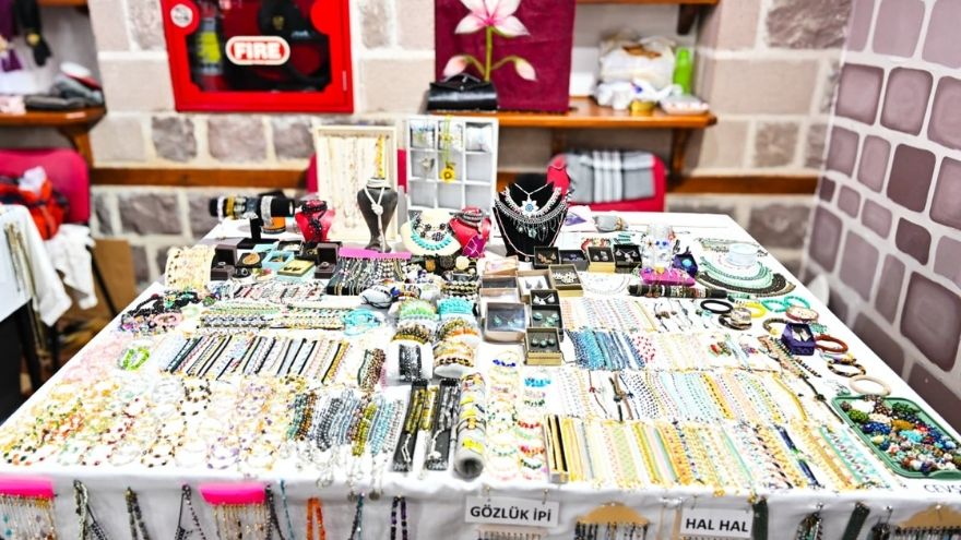 Bebek kıyafetlerinden çantalara, takılardan tesbihlere, el yapımı oyuncaklardan doğal taşlara, anahtarlıklardan örgü kıyafetlere kadar yüzlerce ürün tezgahlarda satışa sunuluyor.
