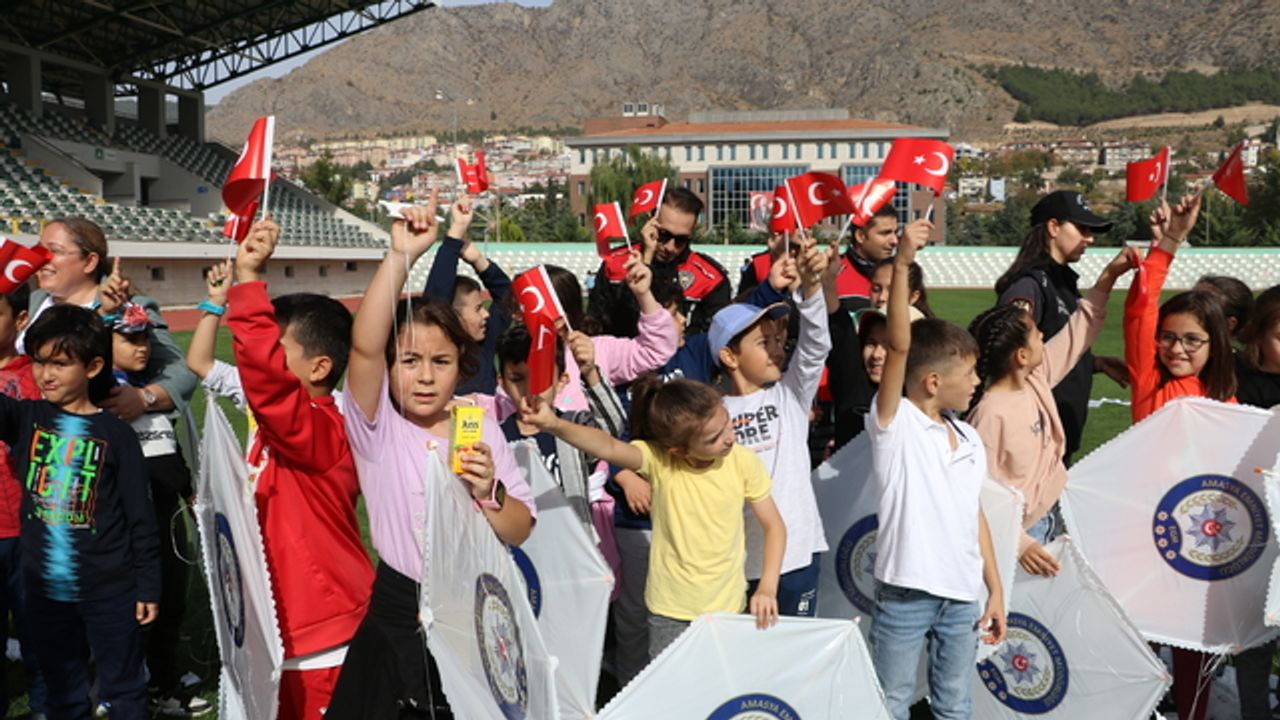 Amasya Emniyet Müdürlüğü Cumhuriyet'in 100'üncü yılında 100 çocukla uçurtma şenliği düzenledi.