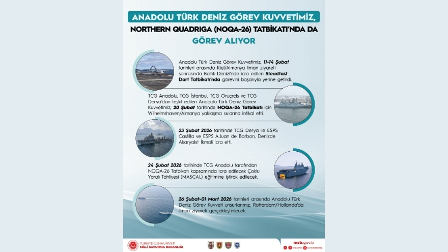 “Steadfast Dart 2026 Tatbikatı’nda görevini başarıyla yerine getiren Anadolu Türk Deniz Görev Kuvveti, şimdi de Northern Quadriga (NOQA-26) Tatbikatı’na katılıyor. Anadolu Türk Deniz Görev Kuvvetimiz, 11-14 Şubat tarihleri arasında Kiel/Almanya liman ziyareti sonrasında Baltık Denizi'nde icra edilen Steadfast Dart Tatbikatı'nda görevini başarıyla yerine getirdi.”
