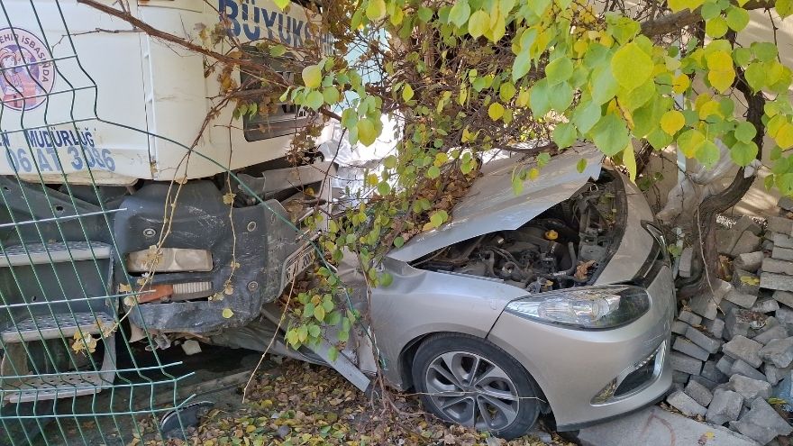 Otomobile çarpması sonucu kontrolden çıkan kamyon, daha sonra park halindeki Ankara plakalı otomobile çarptı.