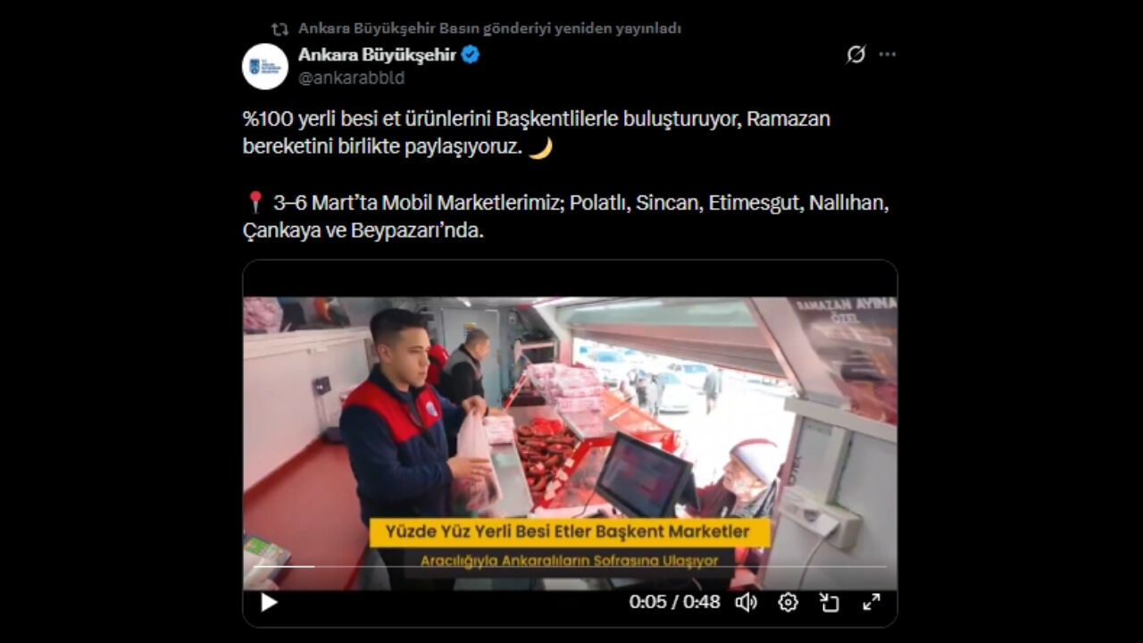 Ankara Büyükşehir Belediyesi, Ramazan ayı öncesinde %100 yerli besi et ürünlerini Mobil Marketler aracılığıyla vatandaşlarla buluşturduğunu duyurdu. 3–6 Mart tarihleri arasında Polatlı’dan Çankaya’ya uzanan 6 ilçede gerçekleştirilecek satışlara Başkentliler yoğun ilgi gösterdi. Belediyenin sosyal medya paylaşımında yer alan vatandaş görüşleri ise uygulamaya duyulan memnuniyeti ortaya koydu.