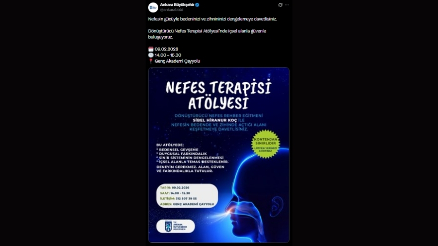 Ankara Büyükşehir Belediyesi, sosyal medya hesapları üzerinden yaptığı paylaşımla vatandaşları nefes ve farkındalık temelli özel bir etkinliğe davet etti. Bedenle zihni buluşturmayı amaçlayan 'Dönüştürücü Nefes Terapisi Atölyesi', Genç Akademi Çayyolu’nda düzenlenecek.
