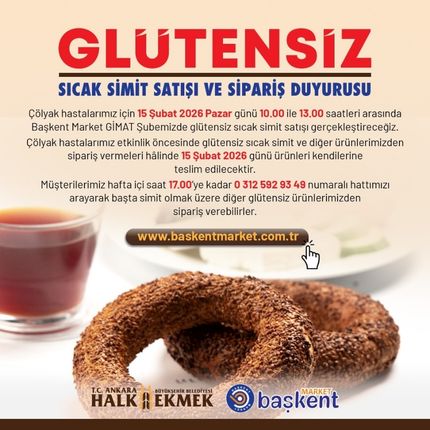 ‘’Çölyak hastalarımız için 15 Şubat 2026 Pazar günü 10.00 ile 13.00 saatleri arasında Başkent Market GİMAT Şubemizde glütensiz sıcak simit satışı gerçekleştireceğiz. Çölyak hastalarımız etkinlik öncesinde glütensiz sıcak simit ve diğer ürünlerimizden sipariş vermeleri hâlinde 15 Şubat 2026 günü ürünleri kendilerine teslim edilecektir. Müşterilerimiz hafta içi saat 17.00'ye kadar 0 312 592 93 49 numaralı hattımızı arayarak başta simit olmak üzere diğer glütensiz ürünlerimizden sipariş verebilirler.’’