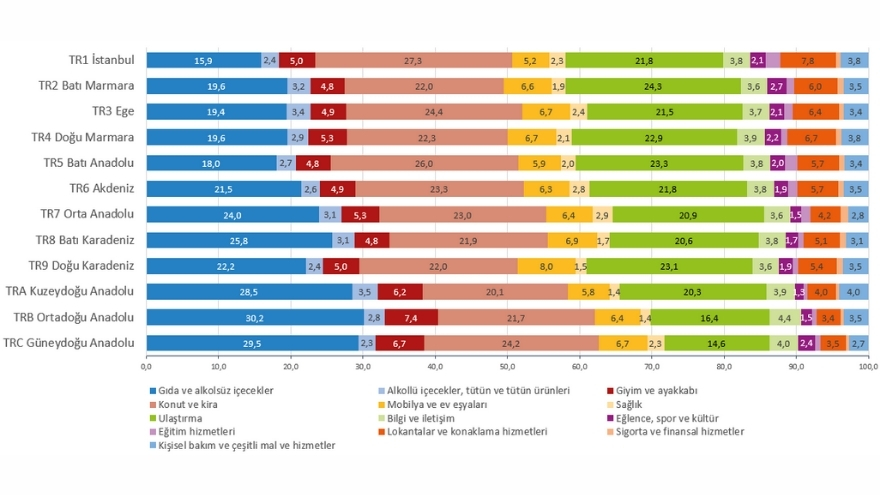 Konut, kira, ulaştırma ve gıda kalemlerindeki bölgesel farklılıklar dikkat çekerken, İstanbul hala en büyük paya sahip bölge oldu.