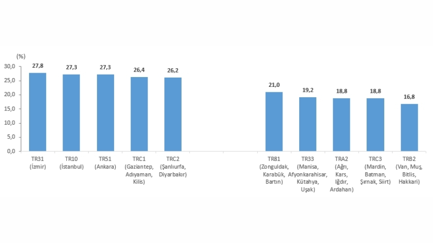 İBBS bölgesel ölçekte yapılan karşılaştırmada konut ve kira harcamalarının en yüksek olduğu bölge yüzde 27,8 ile İzmir oldu. Bu kategoride en düşük payı yüzde 16,8 ile Van, Muș, Bitlis, Hakkari ayırdı.