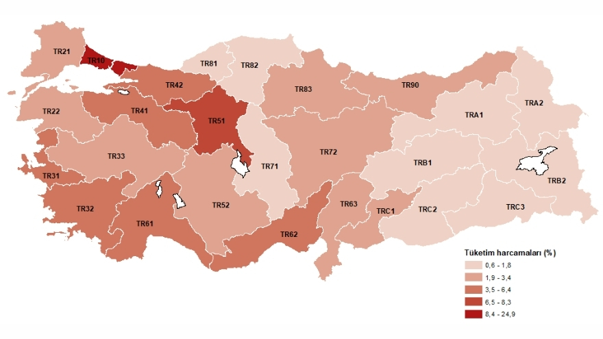Verilere göre hanehalkı tüketim harcamalarının yüzde 24,9’u İstanbul bölgesinde gerçekleşti. Ardından Ege yüzde 15,0 ve Akdeniz yüzde 12,1 ile sıralandı. En düşük payı yüzde 1,5 ile Kuzeydoğu Anadolu aldı. Bu bölgeyi Ortadoğu Anadolu yüzde 2,3 ve Doğu Karadeniz yüzde 3,1 izledi.