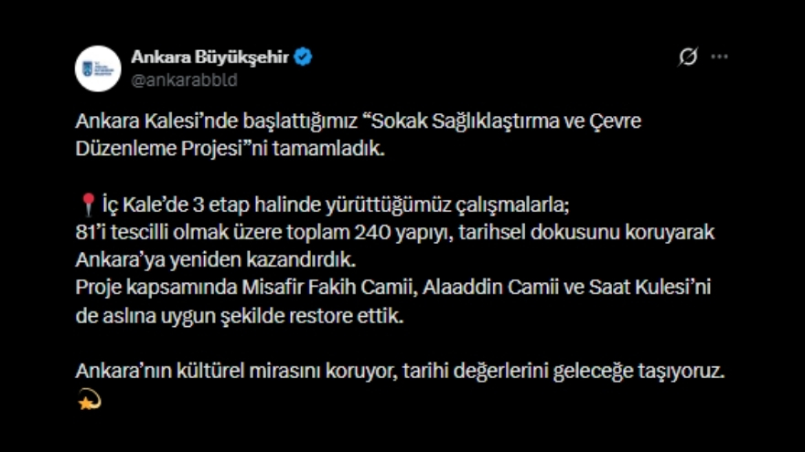 İç Kale’de üç etap halinde yürütülen çalışmalar kapsamında, aralarında tescilli yapıların da bulunduğu yüzlerce yapı tarihsel kimliği korunarak yenilendi. Proje, Ankara’nın kültürel mirasını geleceğe taşıma hedefinin somut adımlarından biri olarak öne çıktı.