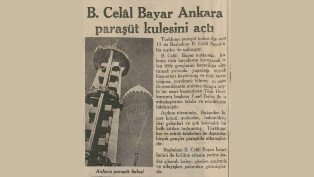 “Türkkuşu paraşüt kulesi dün saat 15 de Başbakan B. Celal Bayar'ın bir nutku ile açılmıştır. B. Celal Bayar nutkunda, kulenin türk havalarımı koruyacak olan türk gençlerini havacılığa alıştırmak yolunda yapacağı büyük hizmetleri kaydetmiş ve türk havacılığına, yorulmak bilmez mesaisi ile memleketin muhtaç olduğu böyle bir eseri kazandıran Türk Hava kurumu başkanı Fuad Bulca ile is arkadaşlarına takdir ve tebriklerini bildirmiştir.