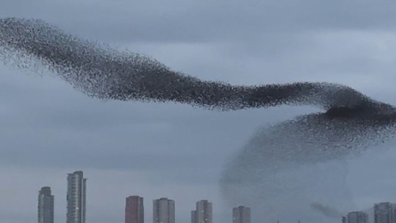 Kısa sürede yoğunlaşan sürü, akşam ışıklarıyla birleşince dikkat çekici görüntüler oluşturdu.