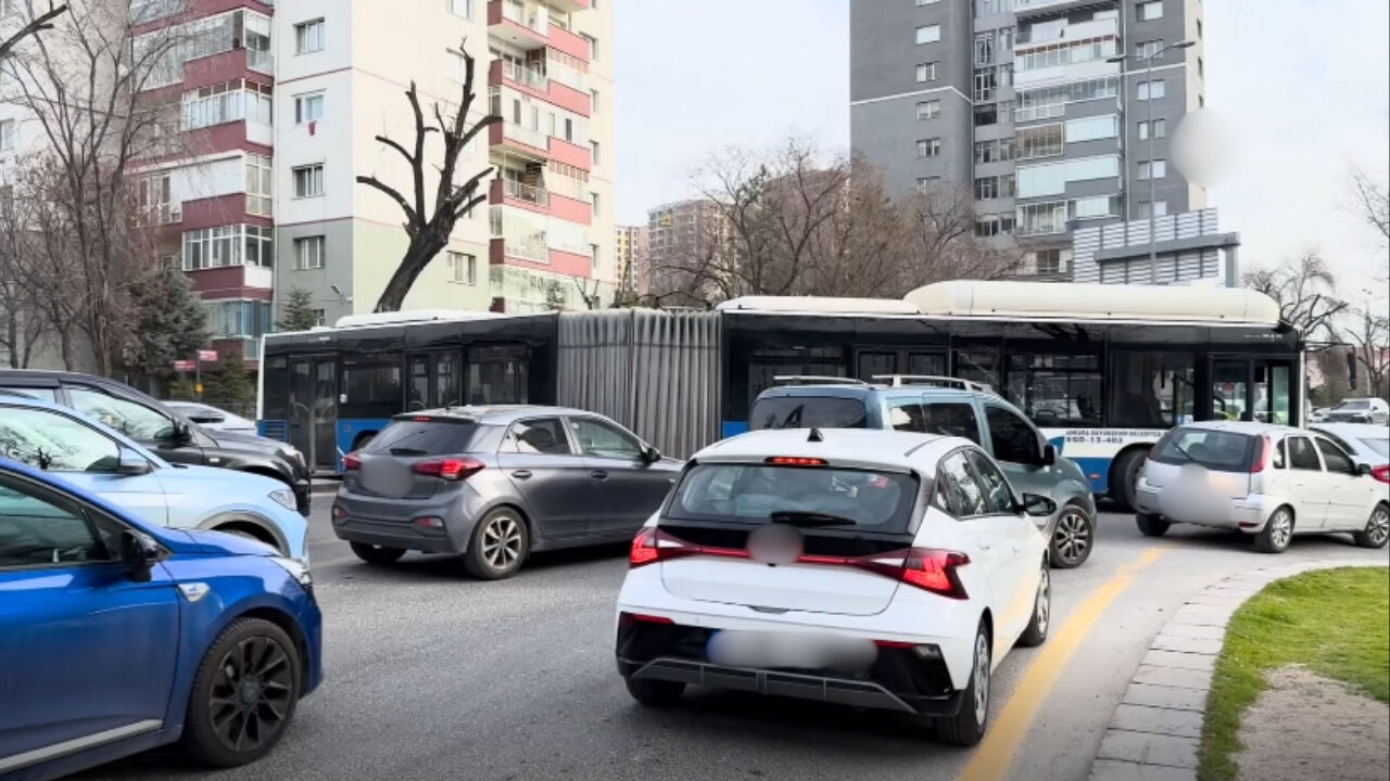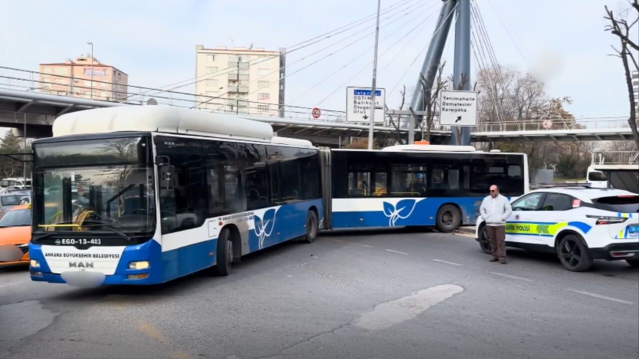 Ankara’nın Yenimahalle ilçesinde sabah saatlerinde yaşanan ilginç bir trafik olayı sürücülere zor anlar yaşattı. Etlik Şehir Hastanesi yakınındaki kavşakta refüj üzerinden U dönüşü yapmaya çalışan bir belediye otobüsü orta refüjde askıda kaldı. Yolun bir bölümünün kapanması nedeniyle kavşakta araç yoğunluğu oluşurken, bölgeye sevk edilen trafik ekipleri ulaşımın tamamen durmaması için araç geçişini kontrollü şekilde sağladı.