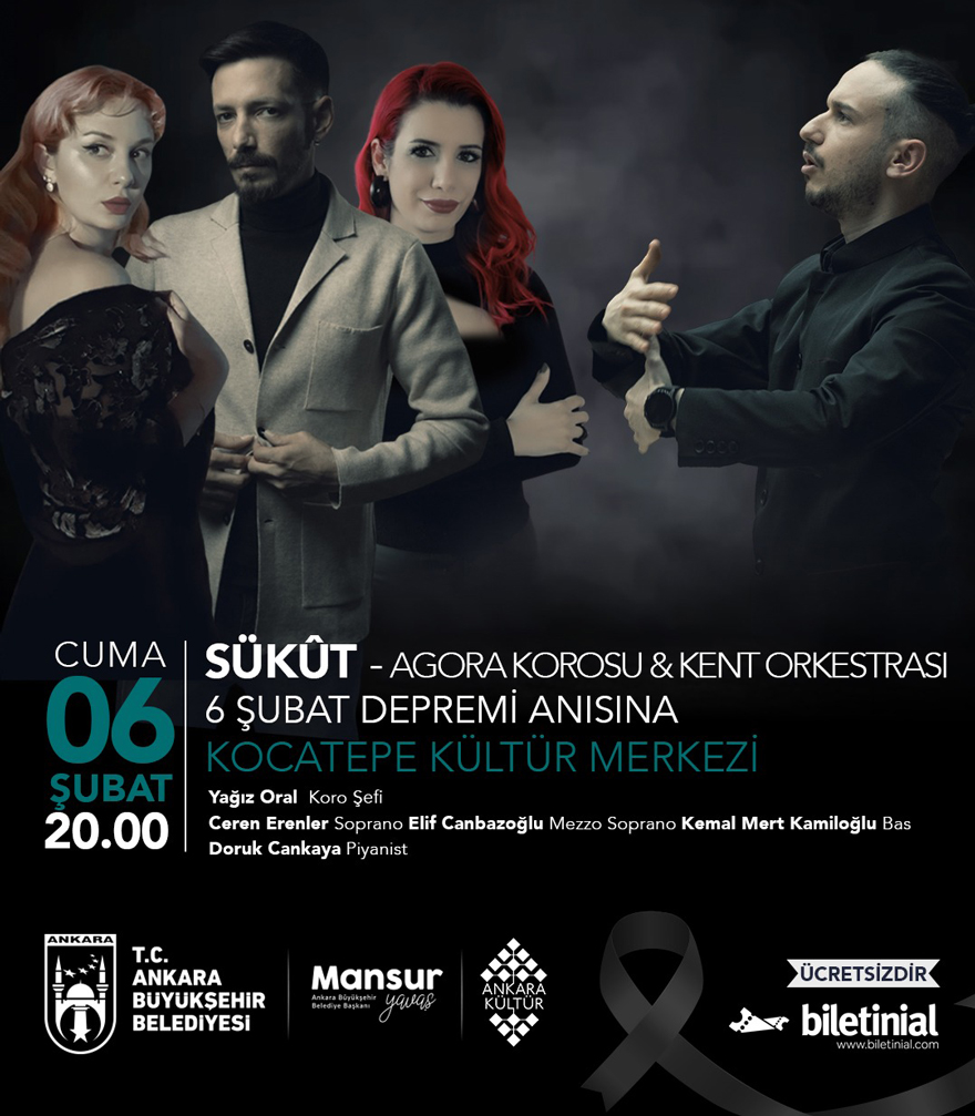 Agora Korosu ve Kent Orkestrası’nın sahne alacağı “Sükût” başlıklı konser, 6 Şubat Cuma günü saat 20.00’de Kocatepe Kültür Merkezi’nde gerçekleştirilecek.