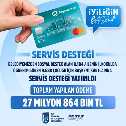 ‘’Ankara’da eğitimde fırsat eşitliği için desteklerimiz sürüyor. Sosyal yardım alan 8.184 ailemizin ilkokula giden 9.688 çocuğu için toplam 27 Milyon 864 Bin TL servis desteği Başkent Kartlara yatırıldı.’’