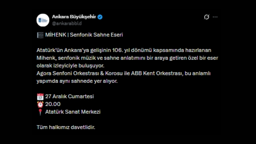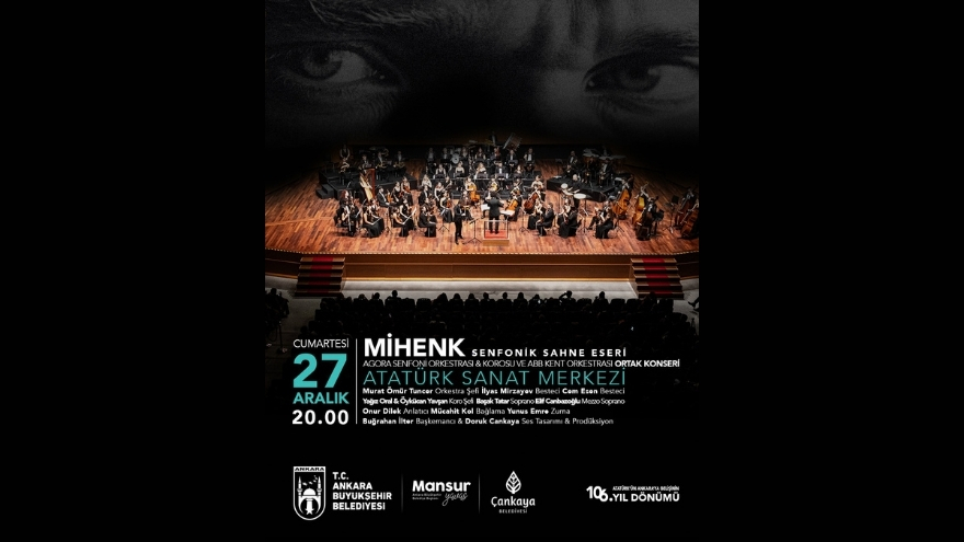 Ankara Büyükşehir Belediyesi, Cumhuriyet tarihinin dönüm noktalarından biri olan Atatürk’ün Ankara’ya gelişinin 106. yıl dönümünü sanatsal bir etkinlikle anıyor. MİHENK adlı senfonik sahne eseri, müziği ve anlatıyı sahnede buluşturan özgün bir yapım olarak 27 Aralık Cumartesi günü Atatürk Sanat Merkezi’nde sahnelenecek.