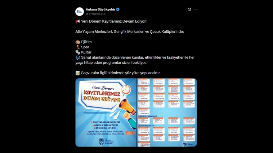 Ankara Büyükşehir Belediyesi, kent genelinde her yaştan vatandaşı kapsayan eğitim, spor, kültür ve sanat programları için yeni dönem kayıtlarının devam ettiğini açıkladı. Belediyenin sosyal medya hesapları üzerinden yapılan duyuruda, aile yaşam merkezleri, gençlik merkezleri ve çocuk kulüplerinde düzenlenen kurs ve etkinliklere dikkat çekildi.