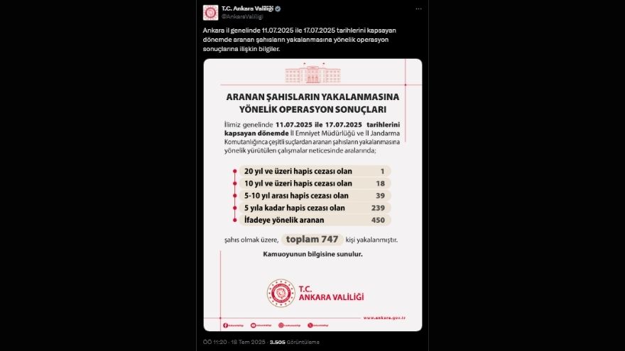 Ankara Valiliği’nin sosyal medya hesabı üzerinden gerçekleştirdiği açıklamada Ankara il genelinde 11.07.2025 ile 17.07.2025 tarihlerini kapsayan operasyon sonuçlarına ilişkin bilgiler paylaşıldı.