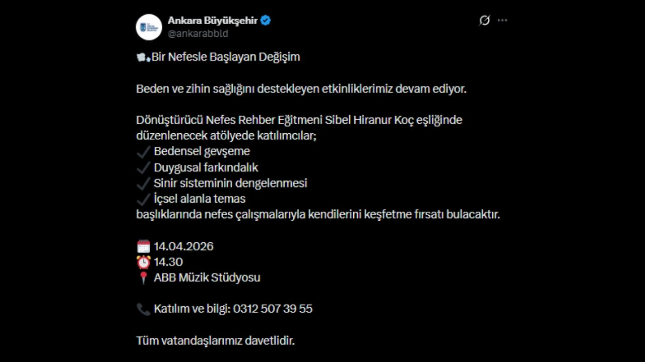 Ankara’da beden ve zihin sağlığını destekleyen etkinlikler hız kesmeden devam ediyor. Bu kapsamda duyurulan yeni atölye programı, katılımcılara nefesin dönüştürücü gücünü deneyimleme fırsatı sunuyor. ‘Bir Nefesle Başlayan Değişim’ başlığıyla düzenlenen etkinlik, hem günlük yaşamın temposundan uzaklaşmak isteyenlere hem de içsel farkındalık arayanlara hitap ediyor.