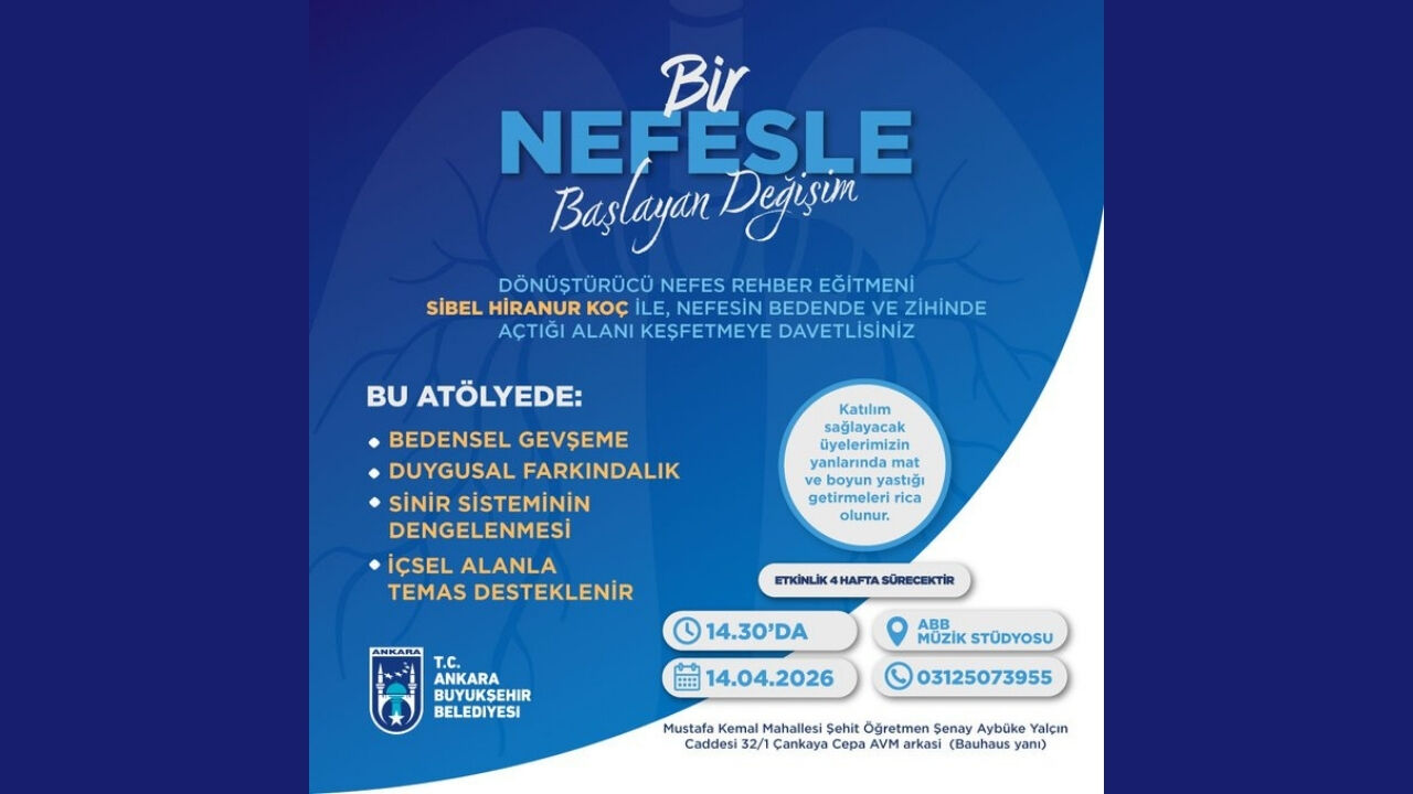 Atölye, Mustafa Kemal Mahallesi Şehit Öğretmen Şenay Aybüke Yalçın Caddesi 32/1 Çankaya adresinde, Cepa AVM’nin arka kısmında bulunan alanda gerçekleştirilecek. Katılımcılar, bu süreçte nefesin dönüştürücü etkisini deneyimleyerek kendilerine kısa bir mola verme fırsatı yakalayacak.