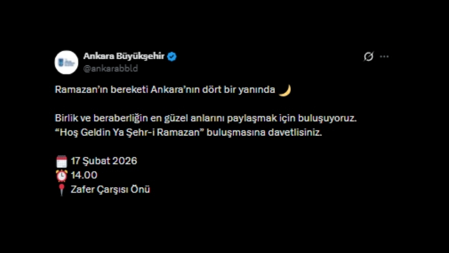“Ramazan’ın bereketi Ankara’nın dört bir yanında. Birlik ve beraberliğin en güzel anlarını paylaşmak için buluşuyoruz. 'Hoş Geldin Ya Şehr-i Ramazan' buluşmasına davetlisiniz.”