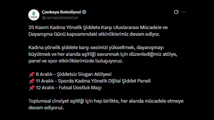 Kadınlara yönelik şiddetle mücadelede farkındalığı artırmak amacıyla Ankara’da düzenlenen etkinlikler, Aralık ayı boyunca farklı başlıklarla sürdürülecek. Programda atölye çalışmaları, akademik paneller ve dostluk temalı spor karşılaşmaları yer alıyor.
