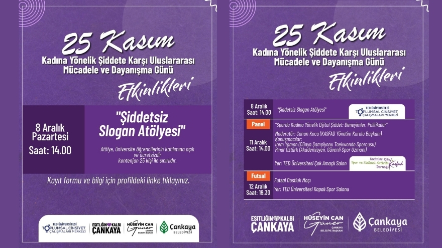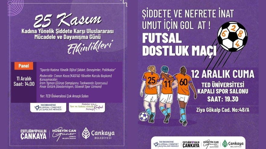 8 Aralık’ta ‘Şiddetsiz Slogan Atölyesi’, 11 Aralık’ta ‘Sporda Kadına Yönelik Dijital Şiddet’ konulu panel ve 12 Aralık’ta ‘Futsal Dostluk Maçı’ ile hem düşünce hem eylem sahasında güçlü bir toplumsal mesaj verilecek.