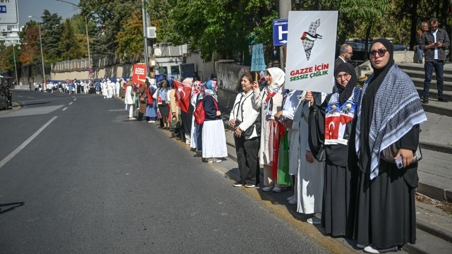 Ankara’da AK Parti İl Kadın Kolları tarafından düzenlenen ‘Gazze İçin Sessiz Çığlık’ etkinliğinde, kadınlar İsrail Büyükelçiliği önünde bir araya geldi.