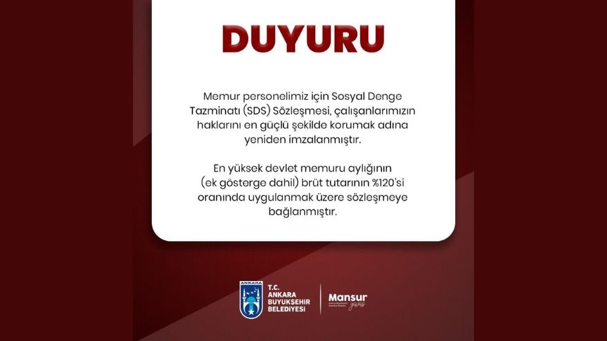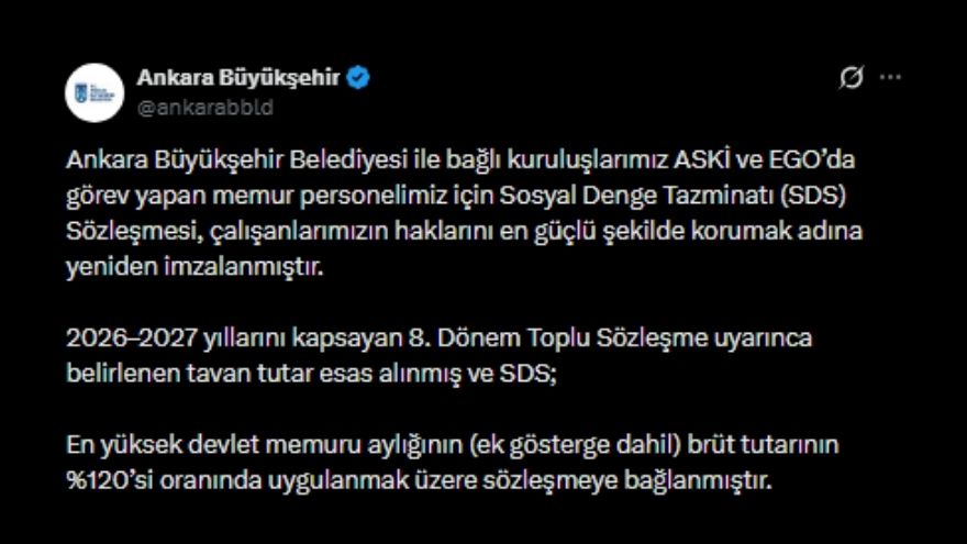 Büyükşehir Belediyesi’nin sosyal medya hesaplarından yapılan açıklamada, “Ankara Büyükşehir Belediyesi ile bağlı kuruluşlarımız ASKİ ve EGO’da görev yapan memur personelimiz için Sosyal Denge Tazminatı (SDS) Sözleşmesi, çalışanlarımızın haklarını en güçlü şekilde korumak adına yeniden imzalanmıştır” ifadeleri kullanıldı. Açıklamada, sözleşmenin 2026-2027 dönemini kapsadığına dikkat çekildi.