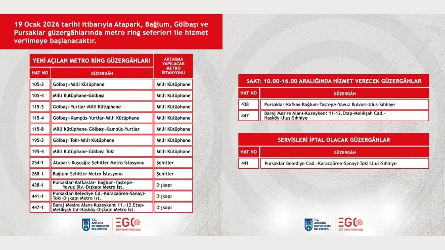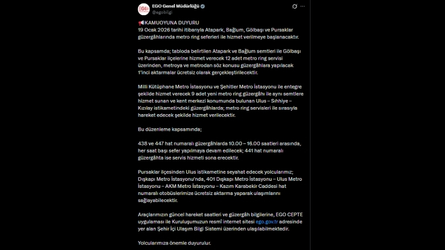 Yeni düzenleme kapsamında Atapark ve Bağlum semtleri ile Gölbaşı ve Pursaklar ilçelerine hizmet verecek toplam 12 metro ring servisi devreye alınıyor. Bu hatlar üzerinden metroya ve metrodan yapılacak birinci aktarmalar ücretsiz olarak gerçekleştirilecek.