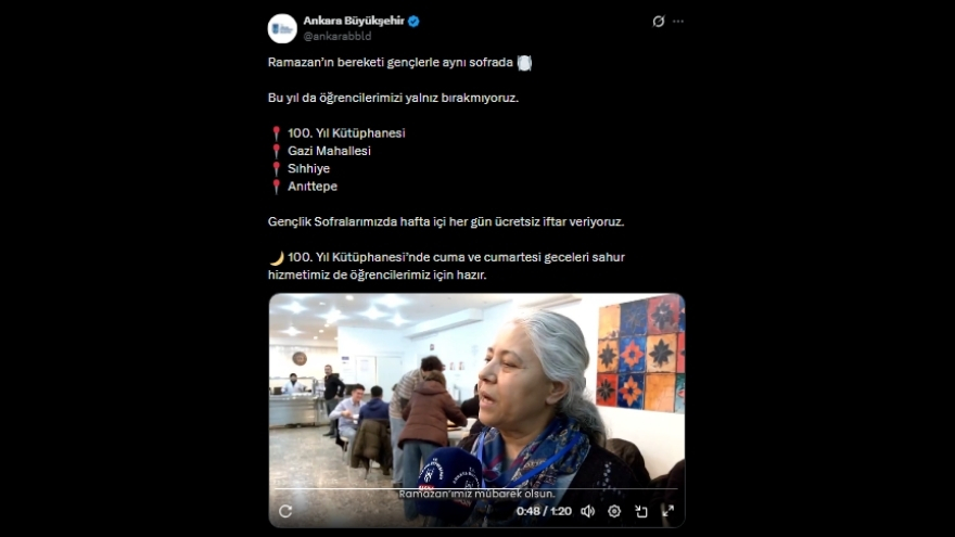 Ankara Büyükşehir Belediyesi, sosyal medya hesabı üzerinden yaptığı paylaşımla öğrenciler için ücretsiz iftar ve sahur hizmetinin başladığını, sofraların adresleri ve hizmet saatleri de paylaşıldı.