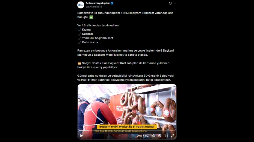 Ankara Büyükşehir Belediyesi, Ramazan ayının ilk gününde kırmızı et satışına ilişkin uygulamanın başladığını duyurdu. Yapılan bilgilendirmeye göre toplam 4.243 kilogram kırmızı et vatandaşlarla buluşturuldu. Yerli üreticilerden temin edilen ürünler, kent genelinde sabit ve mobil satış noktalarında satışa sunulurken, sosyal destek alan vatandaşlar da Başkent Kart bakiyeleriyle alışveriş yapabiliyor.