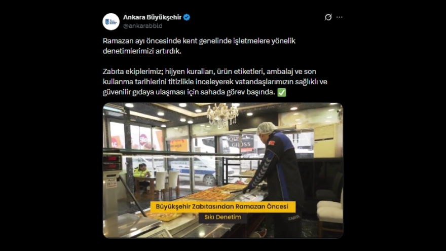 “Ramazan ayı münasebetiyle vatandaşlarımızın sağlıklı gıda tüketimine katkı sağlamak maksadıyla Ankara Büyükşehir Belediyesi, ilçe belediyesi zabıtaları ve sağlık birimleriyle müşterek gıda ve hijyen denetimlerini devam ettiriyoruz. Bu kapsamda çok sayıda iş yeri denetlenmiş olup çalışmalarımız devam etmektedir.”