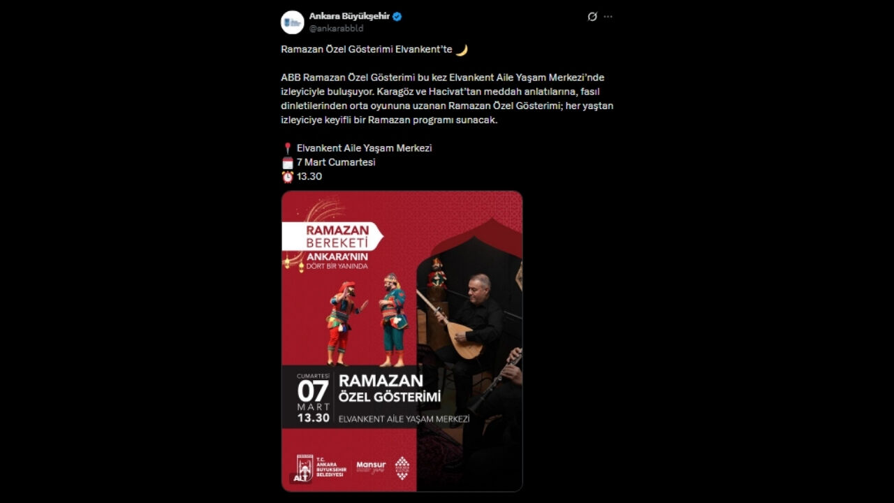 Ankara’da Ramazan etkinlikleri kentin dört bir yanında sürerken, Ramazan Özel Gösterimi bu kez Elvankent’te izleyiciyle buluşacak. Ankara Büyükşehir Belediyesi’nin sosyal medya üzerinden yaptığı duyuruya göre, her yaştan Başkentliye hitap eden program 7 Mart Cumartesi günü saat 13:30’da Elvankent Aile Yaşam Merkezi’nde gerçekleştirilecek.