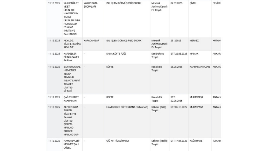Tarım ve Orman Bakanlığı, sahte gıdalar hakkında vatandaşları bilgilendirmeye devam ediyor. Yayınlanan güncel listede Mamak ve Akyurt’ta bulunan iki firmanın ürettiği köfte harcında ve piliç köftede tüketici sağlığını tehdit eden unsurlar tespit edildi.