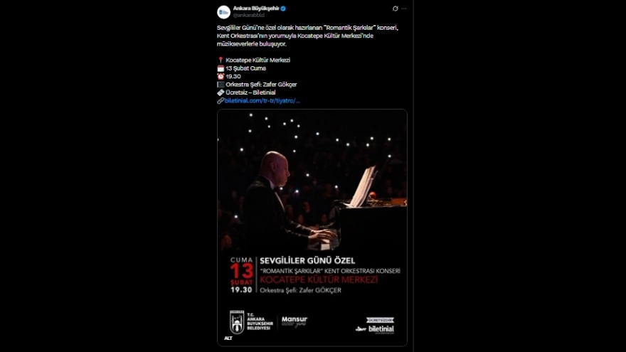 Ankara Büyükşehir Belediyesi, Sevgililer Günü’ne özel hazırlanan konseri sosyal medya hesapları üzerinden duyurdu. Paylaşımda etkinliğe ilişkin şu ifadelere yer verildi: