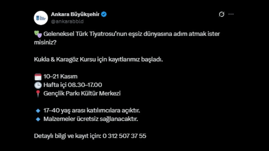 Detaylı bilgi almak isteyen vatandaşlar, 0 (312) 507 37 55 numaralı telefondan yetkililere ulaşabilecek. ABB yetkilileri, bu projeyle hem geleneksel tiyatro kültürünü yaşatmayı hem de gençleri sahne sanatlarına teşvik etmeyi amaçladıklarını belirtti.