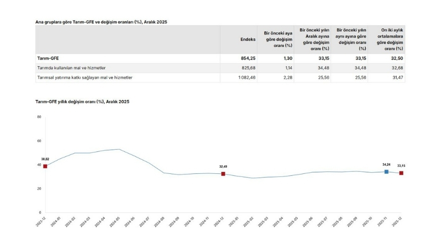 Aralık 2025’te önceki aya göre tarımsal girdi fiyatları yüzde 1,30 yükseldi. Mal ve hizmetler endeksinde yüzde 1,14, tarımsal yatırımlara katkı sağlayan endekste yüzde 2,28 artış gerçekleşti. Aylık bazda en yüksek artış ise yüzde 6,43 ile veteriner harcamalarında görüldü.