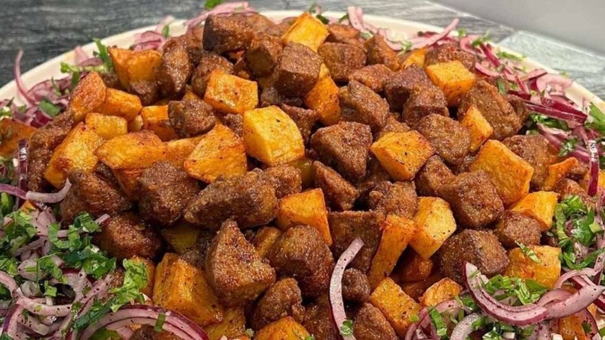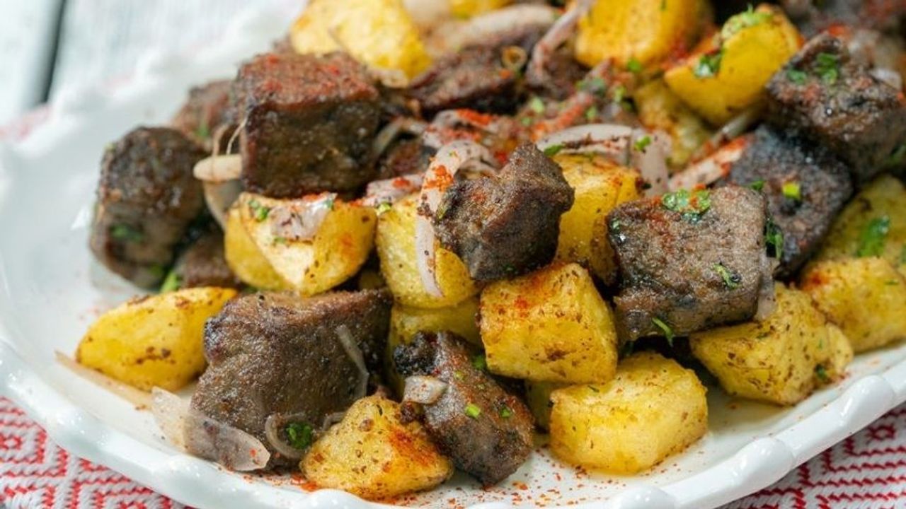 · Kızartılan ciğerler, patates kızartması, sumakla tatlandırılmış kırmızı soğan ve doğranmış maydanozla birlikte servis edilir.