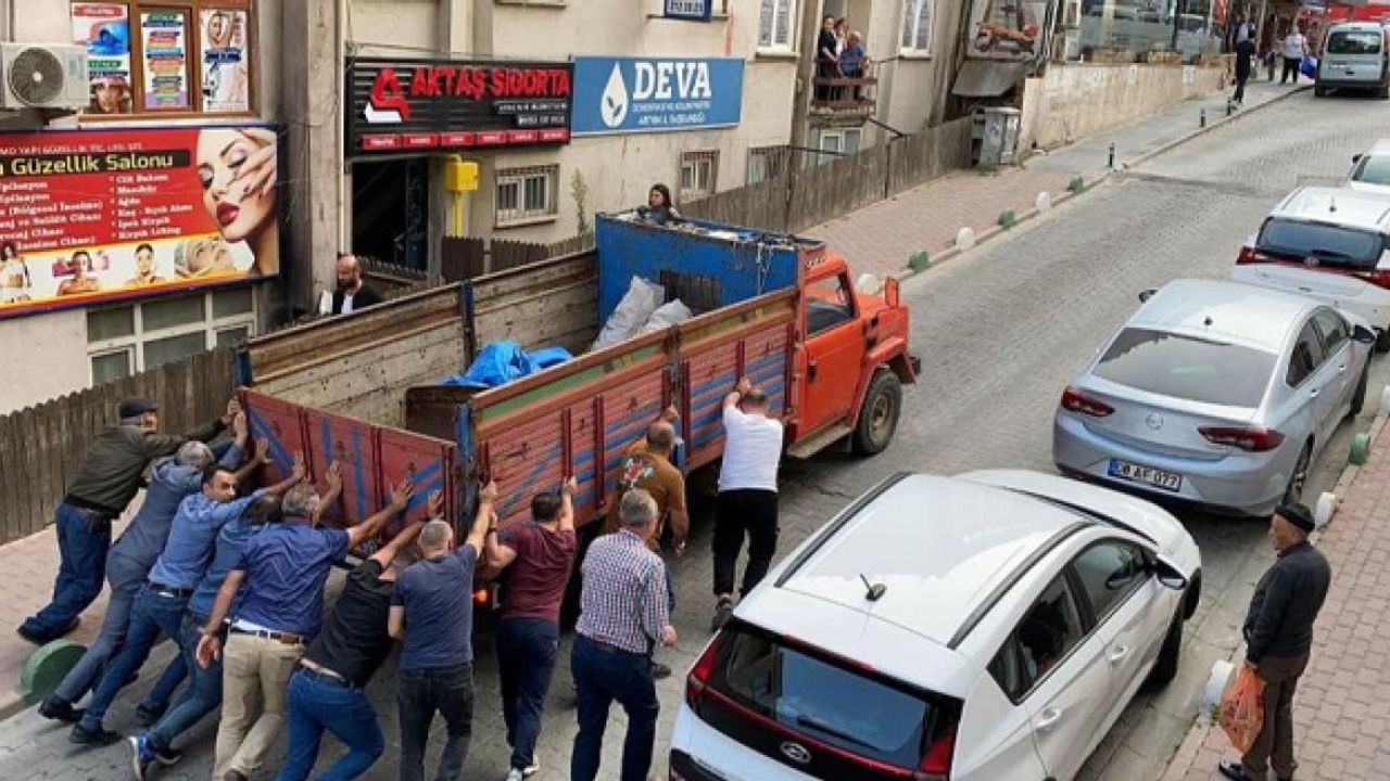 Çevredeki vatandaşlar, sürücünün yardımına koşarak kamyoneti yaklaşık 50 metre uygun alana kadar itti.
