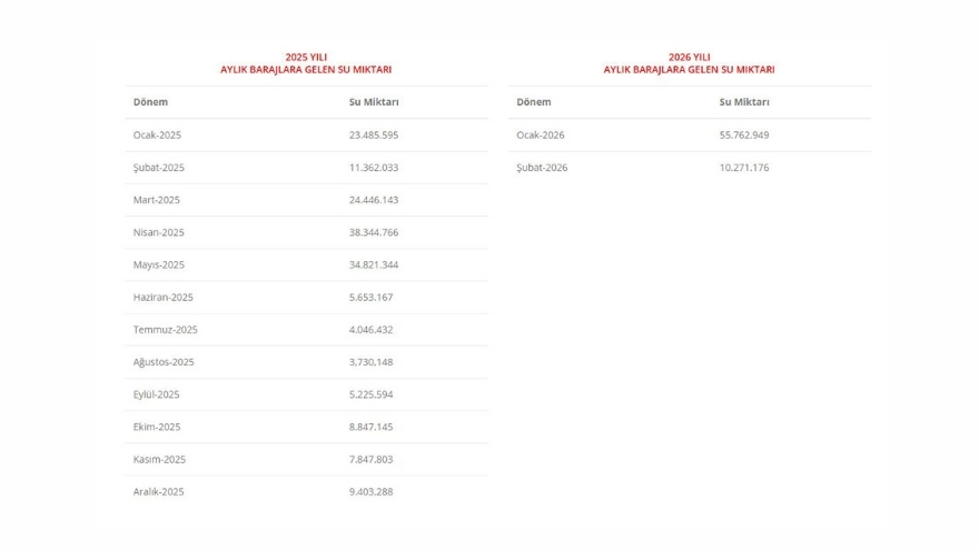 Ankara Su ve Kanalizasyon İdaresi Başkanlığı (ASKİ) verilerine göre, barajlara gelen su miktarı ocak ayında hızla arttı. 2025 Aralık’ta 9 milyon 403 bin 288 metreküp olan su miktarı, 2026 Ocak’ta 55 milyon 762 bin 949 metreküpe ulaştı. Bu artış, son yağışların barajları beslemesiyle doğrudan ilişkilendiriliyor.