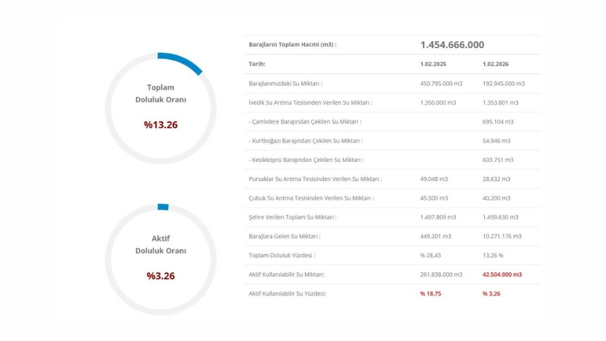 20 Ocak itibarıyla barajların toplam doluluk oranı yüzde 12,62, kullanılabilir aktif su oranı ise yüzde 1,40 olarak ölçülmüştü. 1 Şubat itibarıyla toplam doluluk yüzde 13,26’ya yükselirken, aktif kullanılabilir su miktarı 42 milyon 504 bin metreküp ile yüzde 3,26’ya ulaştı. Bu artış, şehirdeki su yönetimi ve kullanım açısından önemli bir iyileşmeye işaret ediyor.
