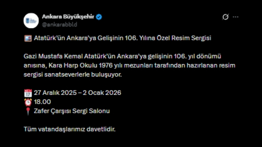 Ankara Büyükşehir Belediyesi, sosyal medya hesapları üzerinden yaptığı duyuruda tüm vatandaşları sergiye davet ederek, bu anlamlı yıl dönümünün sanat aracılığıyla birlikte anılacağını belirtti.