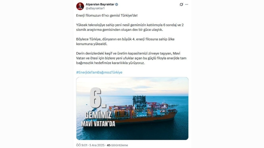 Bayraktar, geminin gelişiyle birlikte Türkiye’nin enerji stratejisinde yeni bir sayfa açıldığını belirterek, “Derin denizlerdeki keşif ve üretim kapasitemizi zirveye taşıyan, Mavi Vatan ve ötesi için bizlere yeni ufuklar açan bu güçlü filoyla enerjide tam bağımsızlık hedefimize kararlılıkla yürüyoruz” dedi.